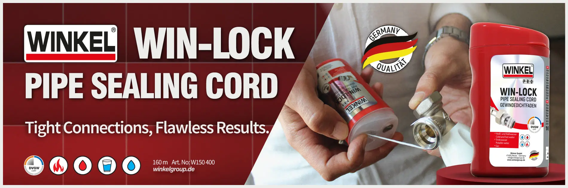 Winkel Win-Lock is a general purpose, threaded pipe and fitting sealant which is wound from the dispensing package onto the threads of the pipe. It is supplied in containers, which serve for both storage and dispensing purposes.